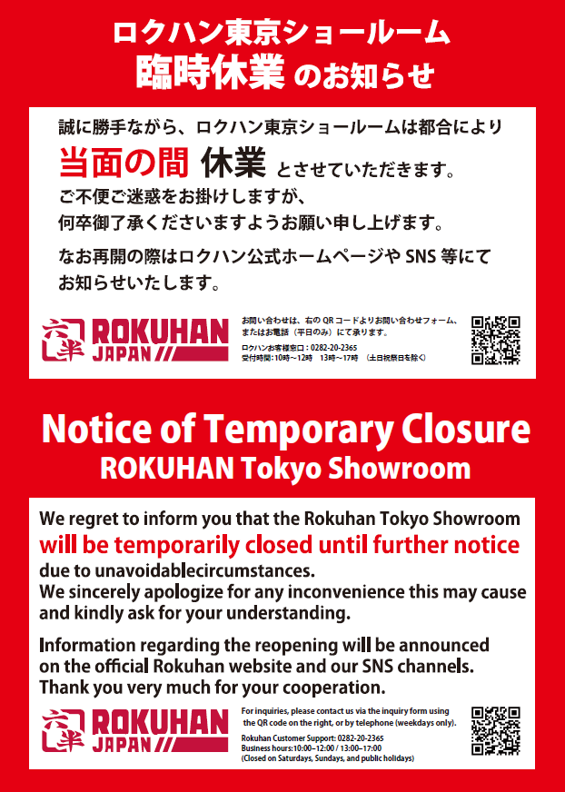 平素よりロクハン東京ショールームをご愛顧いただき誠にありがとうございます。 ロクハン東京ショールームにつきまして、誠に勝手ながら当面の間、臨時休業とさせていただきます。 なお再開の際は、ロクハン公式HPやSNS等にてご案内致します。 お客様には大変ご迷惑をおかけいたしますが、何卒ご理解の程宜しくお願い申し上げます。